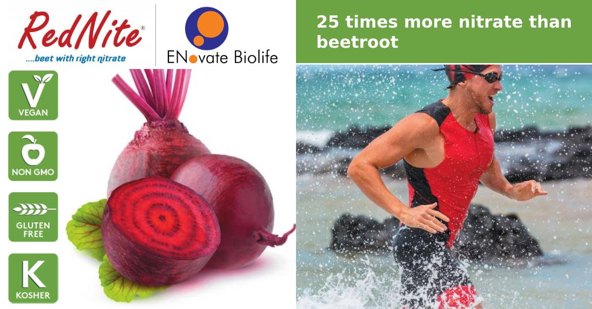 With its dark red colour and pleasant mild sweet taste RedNite® is a valuable source of dietary nitrates compared to vegetables.  It has been developed over 4 years to achieve standardised nitrates and antioxidants.  Grown with a specific seed variety ENoVate Biolife used a solvent free extraction from fresh farm juice.  This enables them to deliver a natural nitrate with betalains and polyphenols.
